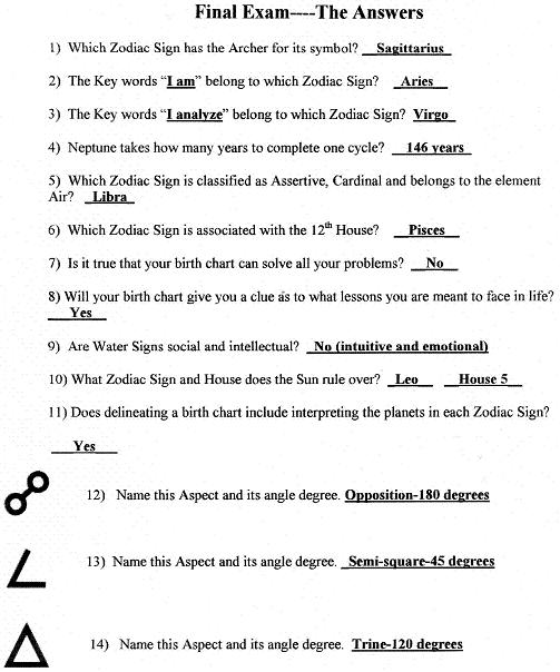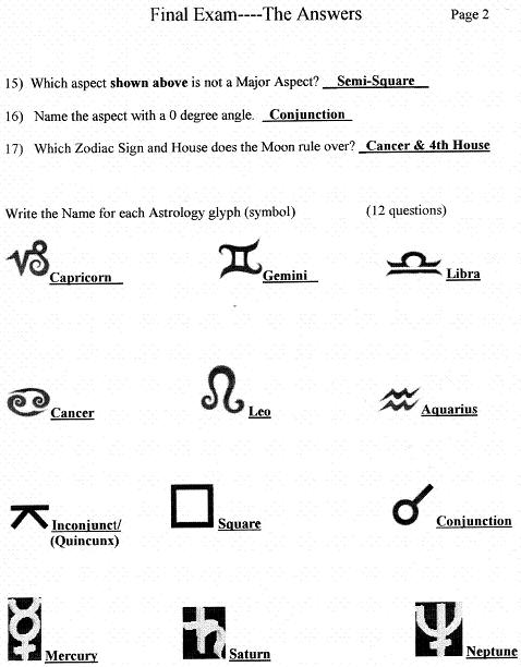 The last (Final Exam) task was to put all the ruling Planet and Zodiac Sign glyphs correctly on the chart as it would appear on a Natural chart. You were to also include the number for each house. Your chart should look similar to the chart below. So long as the information is accurately placed somewhere in the appropriate division you have it correct. Give yourself a bonus point if you included any sub-ruling planets correctly!